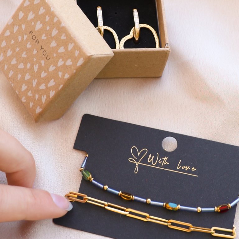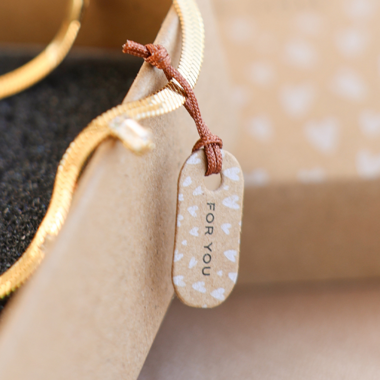 Qui n'a pas envie de recevoir un beau bijou dans un écrin prévu à cet effet, accompagné d'une carte personnalisée ? Les boîtes et les cartes conçues par notre propre équipe de designers avec des textes tels que "For you " et "Pretty things inside" ne manqueront pas de séduire vos clients !
