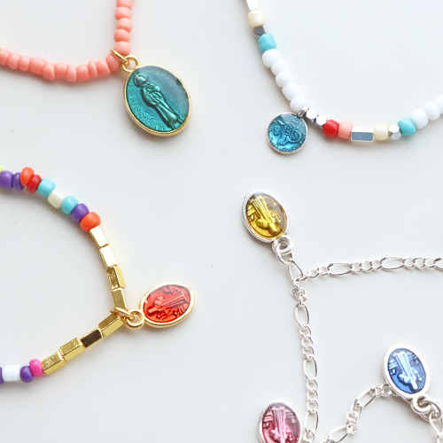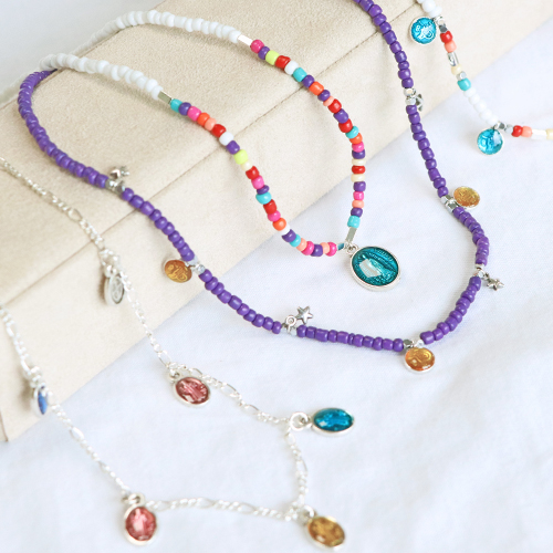 Vous cherchez l’inspiration pour créer des colliers longs et courts à porter ensemble ? Découvrez vite cette collection de breloques en métal DQ avec époxy. Créez une grande variété de colliers en enfilant, par exemple, des perles de rocailles de différentes couleurs et en accrochant une breloque en leur milieu au moyen d’un anneau brisé. Vous pouvez également utiliser plusieurs breloques sur toute la longueur de votre collier. Lorsque vous travaillez avec des mini-perles, nous vous recommandons d’utiliser un tapis à perle. Pour enfiler les perles plus rapidement, vous pouvez également utiliser un Spin-N-Bed. Utilisez un fil de nylon et un wire guardian avant de fixer le fermoir pour protéger votre fil. La confection d’un collier en jaseron avec des breloques est un jeu d’enfant, de plus les breloques ressortent merveilleusement bien. Terminez les colliers avec un joli fermoir et attachez-y une chaînette d’extension pour pouvoir ajuster la longueur.