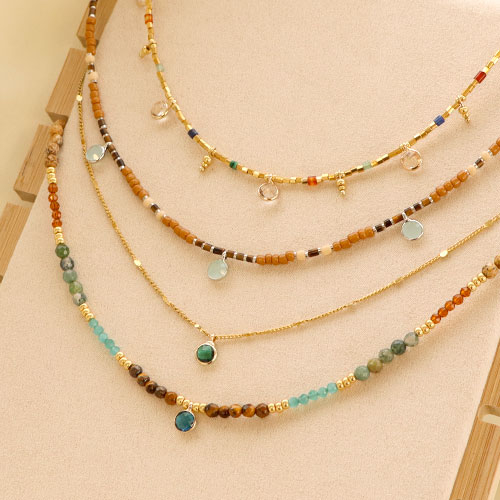 Avec cette série de pendentifs en verre crystal glass, vous pouvez réaliser une belle collection de colliers en un rien de temps. Utilisez du fil métallique pour que les colliers reposent bien autour du cou. Enfilez diverses perles telles que des pierres naturelles, des perles à facettes, des perles en métal DQ que vous combinez avec des perles de rocailles Miyuki dorées. Attachez ensuite les pendentifs aux colliers et fermez-les avec une chaîne d'extension. Portez les colliers ensemble avec des chaînes maille jaseron.