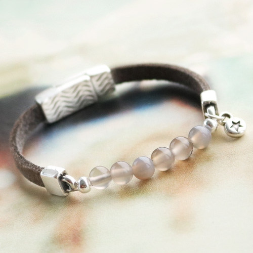 Vous cherchez l'inspiration pour faire des bijoux avec notre nouvelle collection de perles en pierre naturelle ? Alors découvrez vite nos créations de bracelets ! Nous avons combiné les perles en pierre naturelle avec du cuir DQ en utilisant des embouts entre lesquels les perles en pierre naturelle sont enfilées. Voilà un bracelet tout à fait naturel ! Vous pouvez également ajouter des breloques subtiles en métal DQ pour rendre l'ensemble plus ludique. Enfin, nous avons utilisé des perles en bois pour contraster avec les perles en pierre naturelle brillante. Pour l’enfilage des perles, nous avons utilisé du fil élastique. Finissez votre création avec un de nos fermoirs aimantés de notre collection.