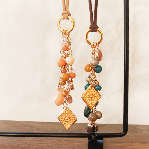 Incontournable dans la création de bijoux, les perles en verre sont des perles polyvalentes qui peuvent être utilisées pour tout type de bijoux. Cette fois-ci nous avons utilisé ces magnifiques perles pour la création des bijoux bohèmes, à savoir deux longs colliers et des boucles d'oreilles assorties. Les colliers longs ont été réalisés en simili cuir daim avec un anneau fermé en métal DQ qui vous permet d’y raccorder de la chaîne maille jaseron avec des perles en verre, des pendentifs en verre Crystal glass et des perles à facettes goutte. Nous avons également fait quelques boucles d’oreilles assorties aux colliers.