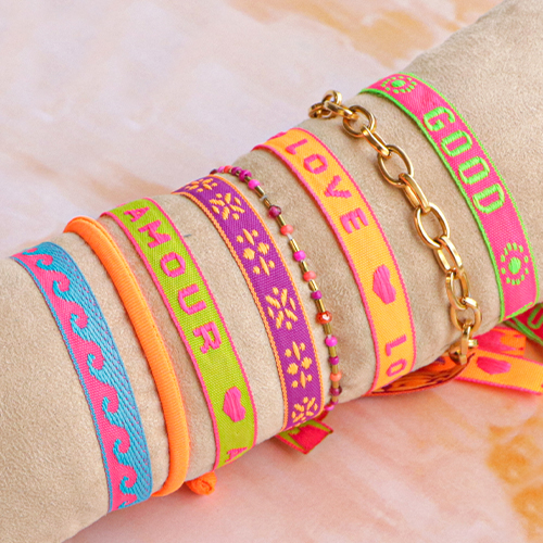 Avec ce ruban texte aux couleurs néon, vous pouvez facilement créer une collection de bracelets super tendance. Choisissez le ruban que vous voulez utiliser et coupez-le à la bonne longueur. Il y a plusieurs façons pour fermer les bracelets; en vous servant d’une perle stoppeur ou bien d’une perle lettre acrylique. En utilisant une perle lettre; vous pouvez ajouter une touche personnelle à votre bracelet !