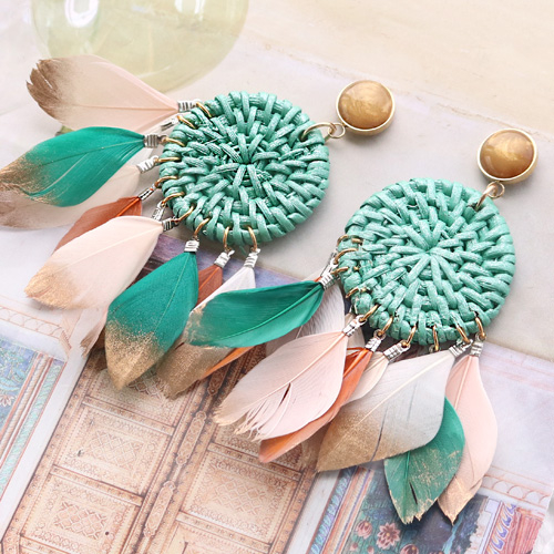 Bijoux festival avec plumes et pendentifs en rotin colorés
