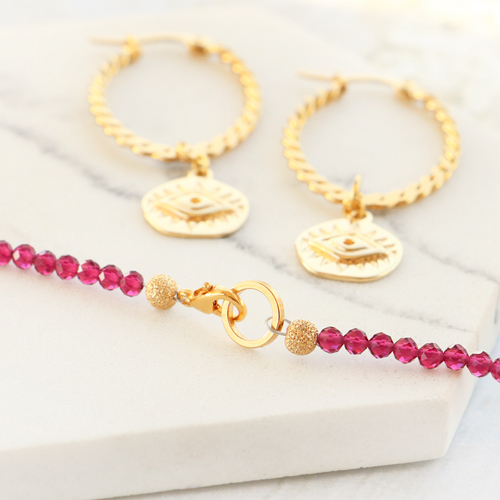Besoin d’inspiration pour réaliser des bijoux tendance avec l’œil porte-bonheur ? Alors vous êtes à la bonne adresse ! Nous avons déjà commencé à travailler avec la gamme et réalisé un certain nombre d’articles contemporains. Confectionnez par exemple un élégant collier en jaseron et accrochez-y votre breloque préférée avec l’œil porte-bonheur / l’œil omniscient. Vous pouvez bien entendu également confectionner des boucles d’oreilles minimalistes et branchées avec ces breloques. Choisissez d’abord un de nos supports boucle d’oreille ou une créole et attachez-y ensuite la breloque « œil porte-bonheur / œil omniscient ». Vous voulez donner plus de couleur à l’ensemble ? Alors, vous pouvez également enfiler des perles de rocailles, des perles à facettes et des perles en métal DQ sur le collier. Utilisez un pendentif avec un œil pour y attacher une breloque.