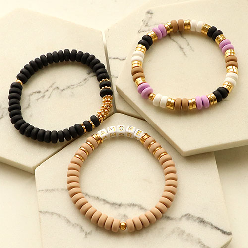 Êtes-vous à la recherche de belles perles colorées pour votre prochaine collection de bijoux ? Alors, découvrez ces nouvelles perles en polymère rondelles et laissez-vous inspirer. Réalisez un ensemble de bracelets avec des perles en polymère de différentes couleurs que vous combinez avec des perles en métal DQ rondelles et spacer et enfilez toutes les perles sur du fil élastique. Utilisez du fil métallique et des perles à écraser pour faire un collier assorti et votre parure de bijoux est complète !