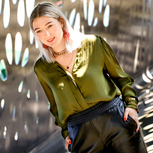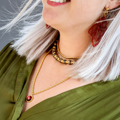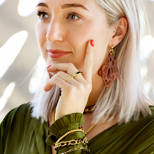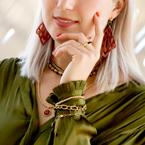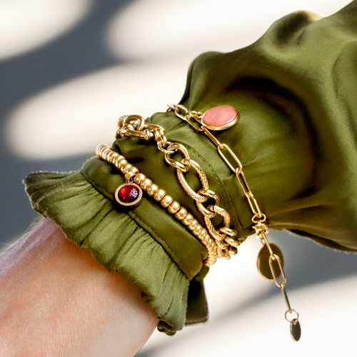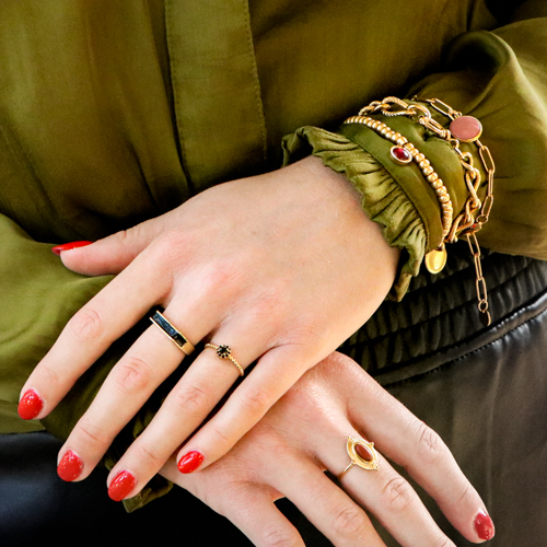 La tendance puissance sensuelle est une tendance méga puissante et féminine qui comprend de vraies pièces bien présentes. Pensez par exemple à l’usage de breloques en résine, de perles en céramique, de colliers ras de cou et de bracelets que vous roulez autour de vos manches. Les grosses bagues font aussi partie de cette tendance.