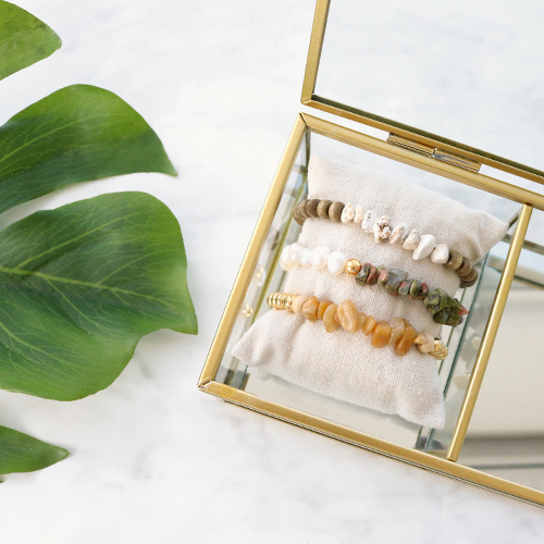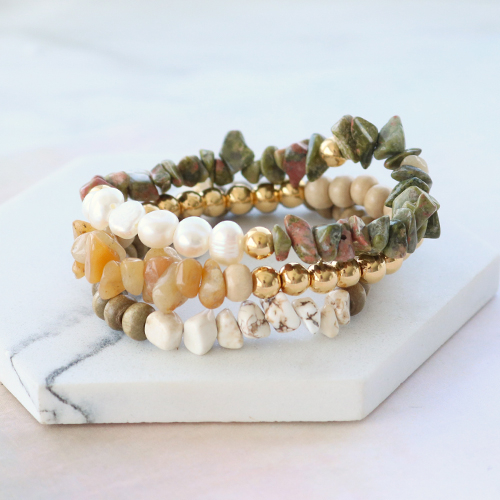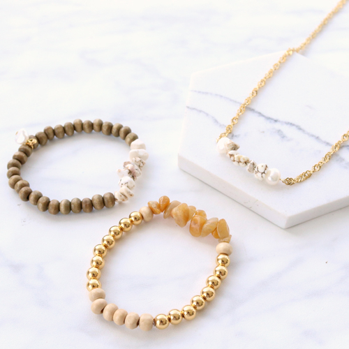 On adore ces magnifiques bijoux ! Quand on a reçu cette nouvelle série de perles Chips, on ne pouvait pas choisir quoi faire avec ; les possibilités sont infinies ! C'est pourquoi nous avons décidé de faire des parures avec des colliers, des bracelets et des boucles d’oreilles que vous pouvez combiner ou porter seul. Nous avons combiné les perles Chips en pierre avec des perles, breloques et apprêts en métal DQ, des perles de rocailles preciosa et des perles d'eau douce. Pour voir toutes les pièces utilisées, il vous suffit de faire défiler vers le bas.